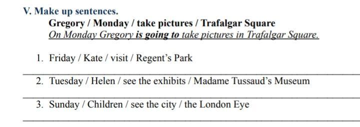 1) On friday Kate is going to visit Regent's park 2)On tuesday Helen Is going to See the exhibits in Madame Tussaud's museum 3) On eunday children are going to see the city in the London
