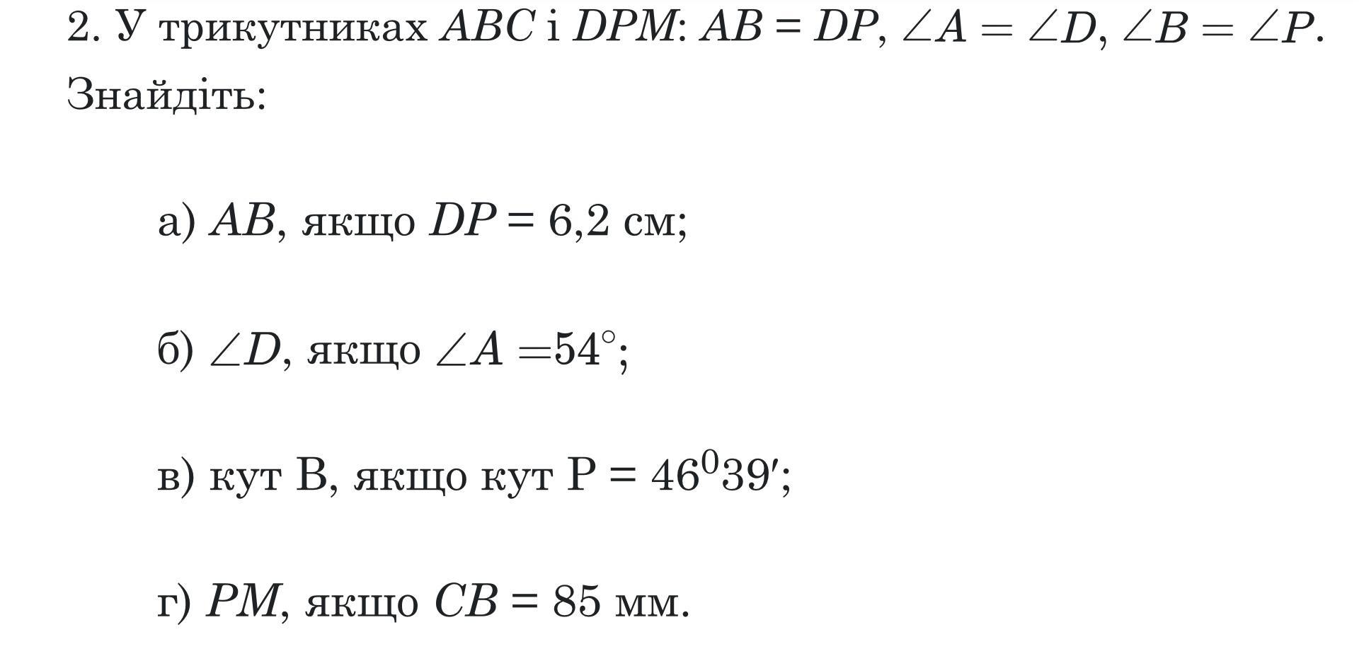 У трикутниках АВС і DPM: АВ = DP, Знайдіть: