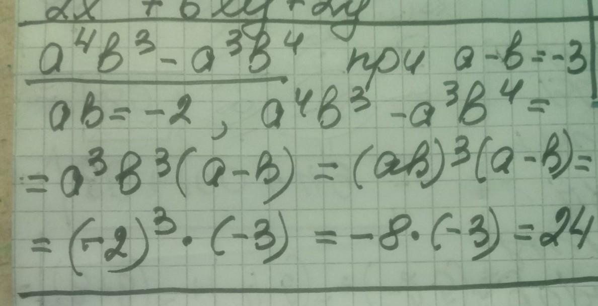 2) a ^ 4 * b ^ 3 - a ^ 3 * b ^ 4 при a - b = - 3 , ab = 2
