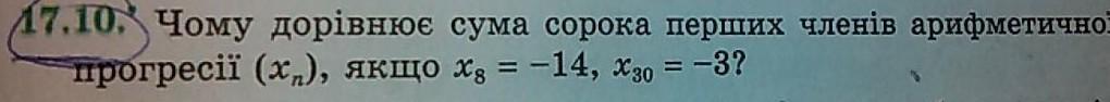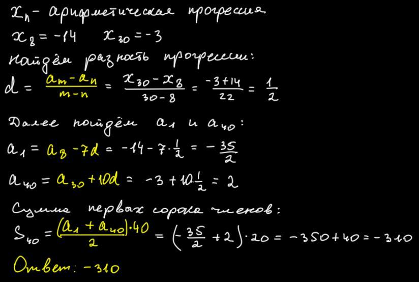 Чому дорівнює сума сорока перших членів арифметичної прогресії, якщо x(8)= -14, x(30)= -3?