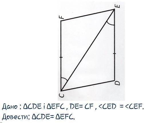 FEC = ECD, ECF = CED як внутрішні різносторонні при січній ЕС, EC - спільна сторона , тоді трикутники рівні за 2-ма кутами та стороною. Або CF = DE, ECF = CED як внутрішні різносторонні при січній ЕС, EC - спільна сторона , тоді трикутники рівні за 2-ма сторонами та кутом. Або: CDEF - паралелограм , CE -діагональ, а діагональ ділить паралелограм на 2 рівних трикутники