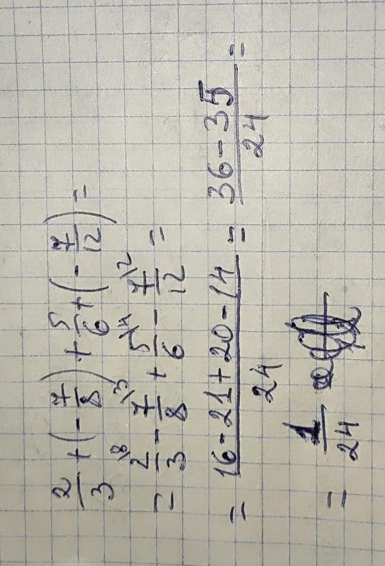 1) 2/3 + ( - 7/8 ) + 5/6 + ( - 7/12 ) = 16/24 - 21/24 + 5/6 + ( - 7/12 ) =