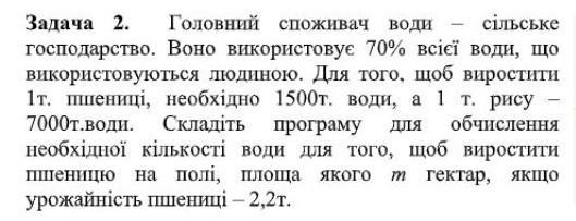 Задача 2. Головний споживач води господарство. Воно використовує 70% всієї води, що використовуються людиною. Для того, щоб виростити 1т. пшениці, необхідно 1500т. води, а 1 т. рису 7000т.води. Складіть програму ДЛЯ ОБЧИСЛЕННЯ необхідної кількості води для того, щоб виростити Пшеницю на полі, площа якого м гектар, якщо урожайність пшениці - 2,2т. -