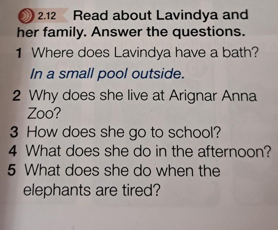 her family. Answer the questions. 1 Where does Lavindya have a bath? In a small pool outside. 2 Why does she live at Arignar Anna Zoo? 3 How does she go to school? 4 What does she do in the afternoon? 5 What does she do when the elephants are tired?