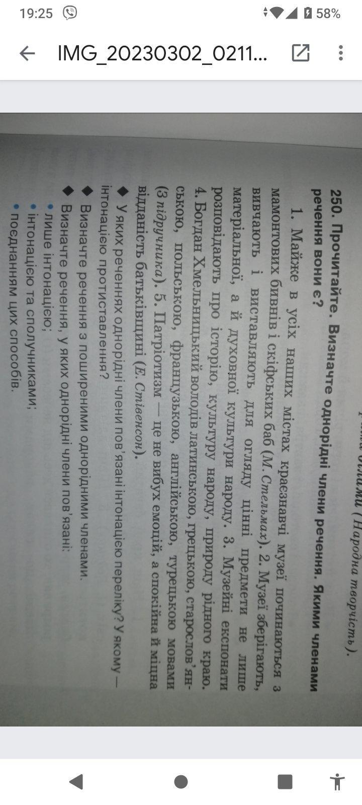 1. Майже в усіх наших містах краєзнавчі музеї починаються з мамонтових бивнів і скіфських баб (М. Стельмах). 2. Музеї зберігають, вивчають і виставляють для огляду цінні предмети не лише матеріальної, а й духовної культури народу. 3. Музейні експонати розповідають про історію, культуру народу, природу рідного краю. 4. Богдан Хмельницький володів латинською, грецькою, старослов'ян ською, польською, французькою, англійською, турецькою мовами (3 підручника). 5. Патріотизм - це не вибух емоцій, а спокійна й міцна відданість батьківщині (Е. Стівенсон).