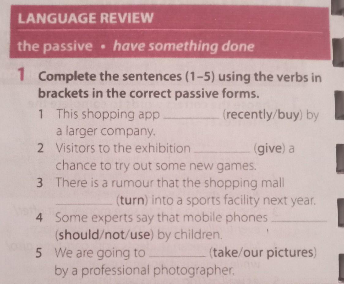 LANGUAGE REVIEW the passive have something done 1 Complete the sentences (1-5) using the verbs in brackets in the correct passive forms. (recently/buy) by (give) a 3 chance to try out some new games. There is a rumour that the shopping mall (turn) into a sports facility next year. 4 Some experts say that mobile phones (should/not/use) by children. 1 This shopping app a larger company. 2 Visitors to the exhibition 5 We are going to (take/our pictures) by a professional photographer.