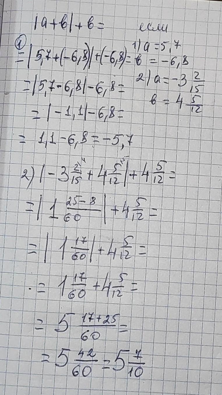 |а + в| + в = |5,7 + (-6,8)| + (-6,8) = |5,7 - 6,8| - 6,8 =