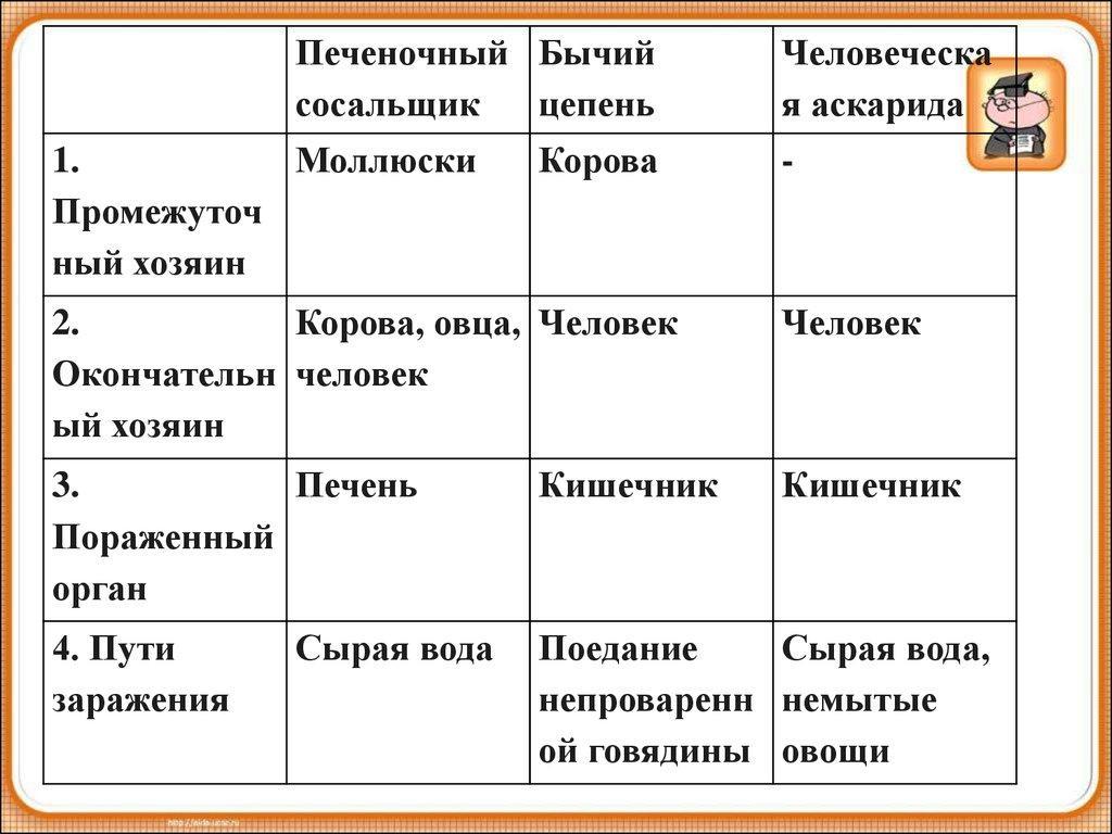 Печеночный сосальщик: 2 присоски, чтобы прикрепляться, тело покрыто кутикулой, мощная мышечная система, аноеробный тип дыхания, оргнов чувств нет, разветвленный кишечник. Они вызывают болезнь у людей когда паразетируют- фастиолез. Профилактика:1. не пить воды из реки и озер" вести борьбу с прудовиками.