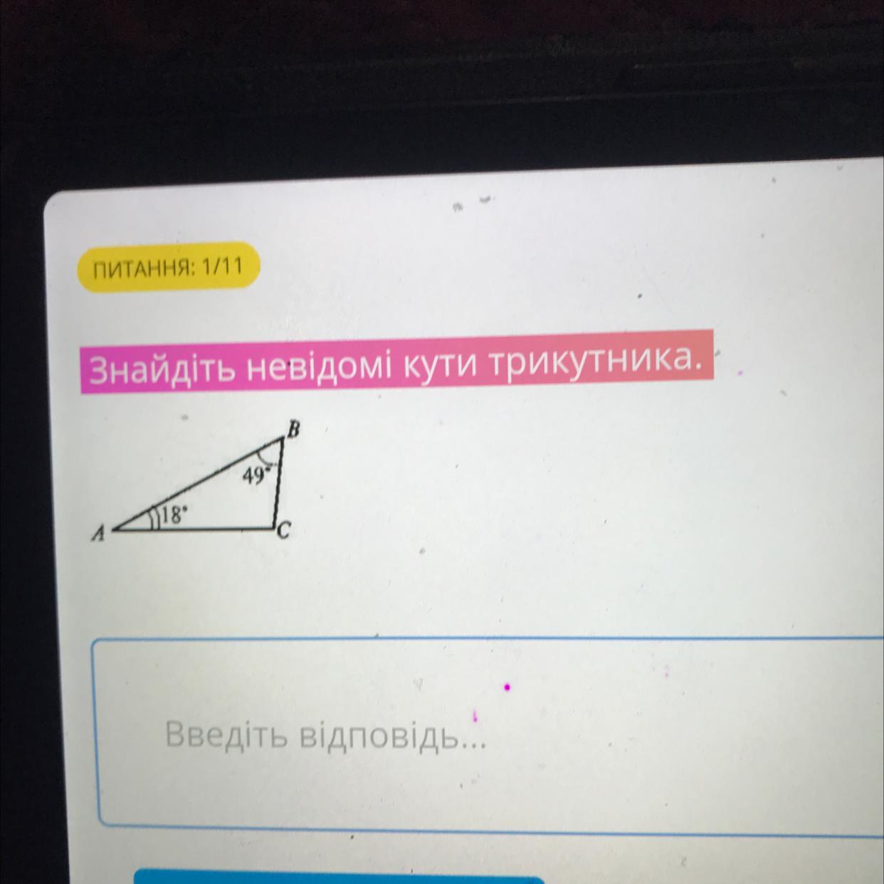 сума кутів трикутника=180° а тобі відомі 2 кута віднявши суму двох відомих кутів трикутника об суму трьох кутів трикутника знайдеш третій не відомий кут