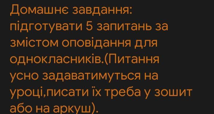 Домашнє завдання: підготувати 5 запитань за змістом оповідання "Дорогою ціною" для однокласників.(Питання усно задаватимуться на уроці,писати їх треба у зошит або на аркуш).