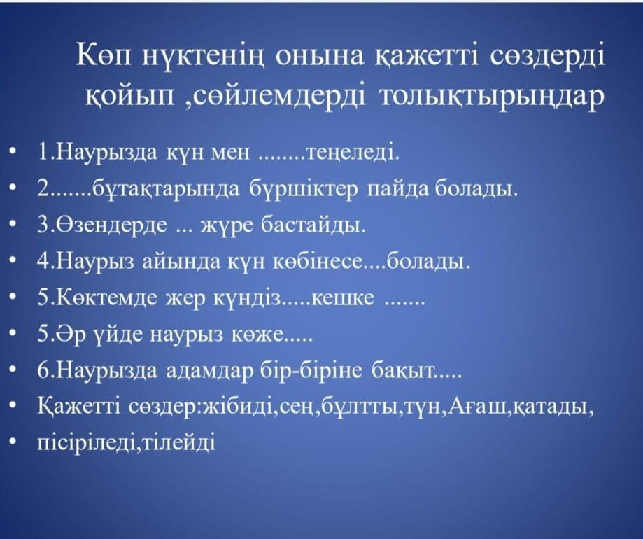 ● ● ● ● ● ● ● ● ● Көп нүктенің онына қажетті сөздерді қойып ,сөйлемдерді толықтырыңдар 1.Наурызда күн мен ...теңеледi. 2.......бұтақтарында буршiктер пайда болады. 3.Өзендерде жүре бастайды. 4.Наурыз айында күн көбінесе....болады. 5.Көктемде жер күндіз.....кешке 5.Әр үйде наурыз көже..... ... ........ ....... 6.Наурызда адамдар бір-біріне бақыт..... Қажетті сөздер:жібиді,сең,бұлтты,түн,Ағаш,қатады, пiсiрiледi, тiлейдi. вставь пропущенные слова. пж очень надо