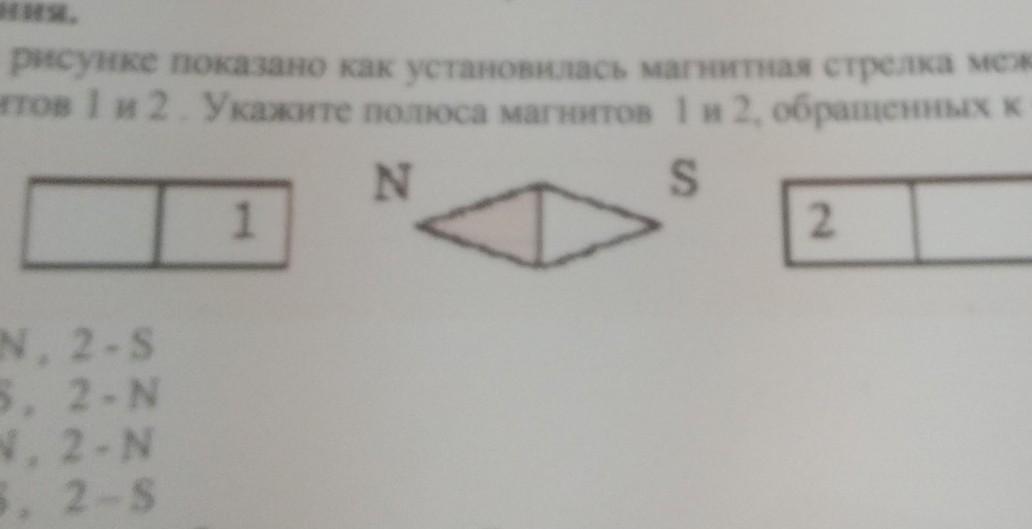 Задания. 1. На рисунке показано как установилась магнитная стрелка между полюсами двух одинаковых магнитов 1 и 2. Укажите полюса магнитов 1 и 2, обращенных к стрелке. N S A)1-N, 2-S B)1-S, 2-N C) 1- N, 2-N D)1-S. 2-S 1 2 [16]