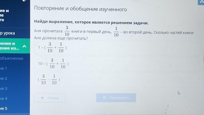 /lesson/bf6d9716-9343-4b48-85b0-ee3dcff59bc2/lesson Повторение и обобщение изученного Найди выражение, которое является решением задачи. 1 10 3 Аня прочитала книги в первый день, 10 Аня должна еще прочитать? 3 1 + ) 10 1 − ( 10 10- ( 3 10 3 10 1 10 1 + ) 10 CEA AD во второй день. Сколько частей книги