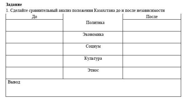 1. Сделайте сравнительный анализ положения Казахстана до и после независимости До После Вывод Политика Экономика Социум Культура Этнос