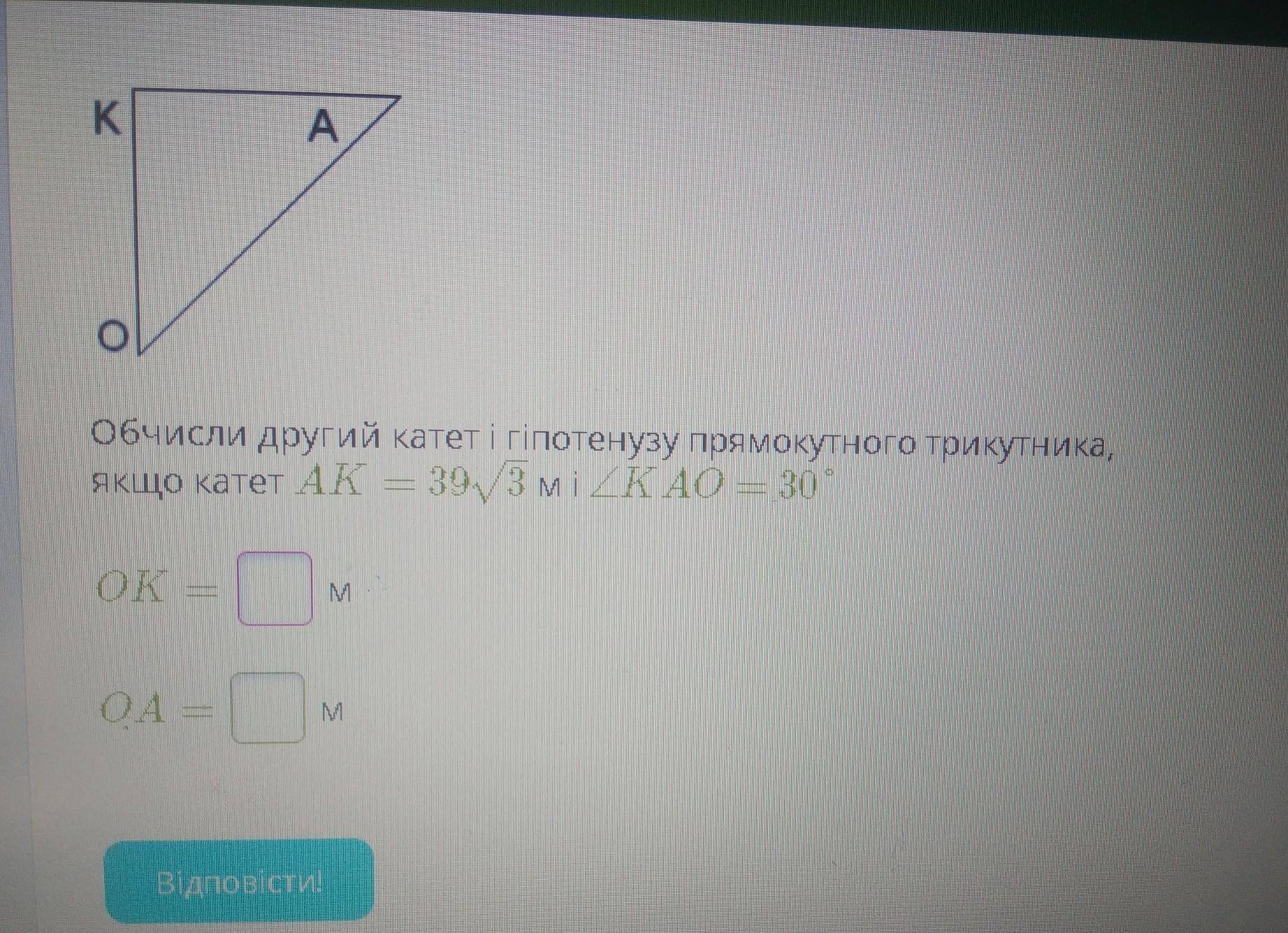 K A обчисли другий катет / гіпотенузу прямокутного трикутника, якщо катет АК = 30√3 mi ZK AO = 30² OK QA = M M