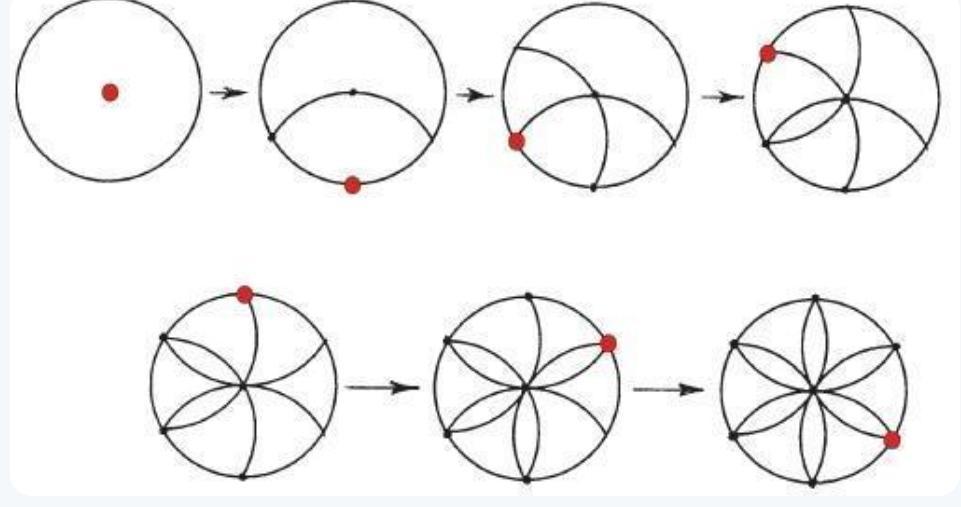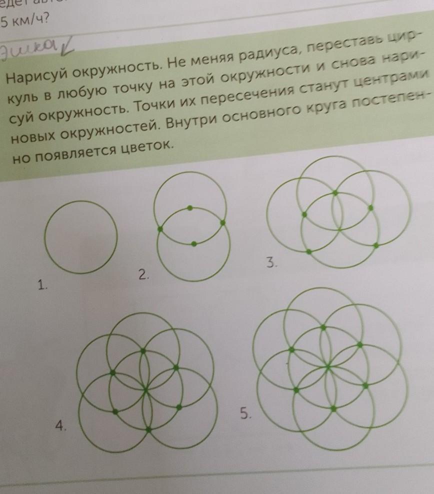 16 Нарисуй окружность. Не меняя радиуса, переставь цир- куль в любую точку на этой окружности и снова нари- суй окружность. Точки их пересечения станут центрами новых окружностей. Внутри основного круга постепен- но появляется цветок. 1. 4. о 2. Ю 5. 3.