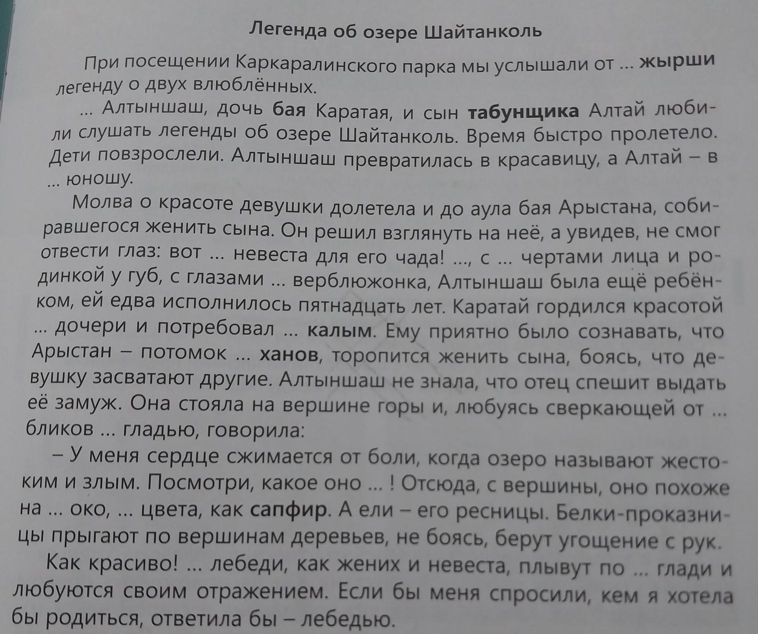 Пользуясь толковыми словарями, объясните значения выделенных слов. Ответьте на вопросы и выполните задания. С чем сравнивается озеро Шайтанколь в тексте? Какие слова передают красоту Алтыншаш? Определите основную мысль текста. Составьте > и > вопросы по тексту легенды. Определите ключевые слова. Что вы можете сказать о традициях того времени? Заполните таблицу примерами из текста. Определите, для чего используются синонимы, эпитеты и сравнения в данном тексте.