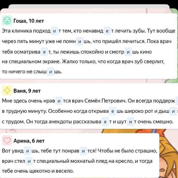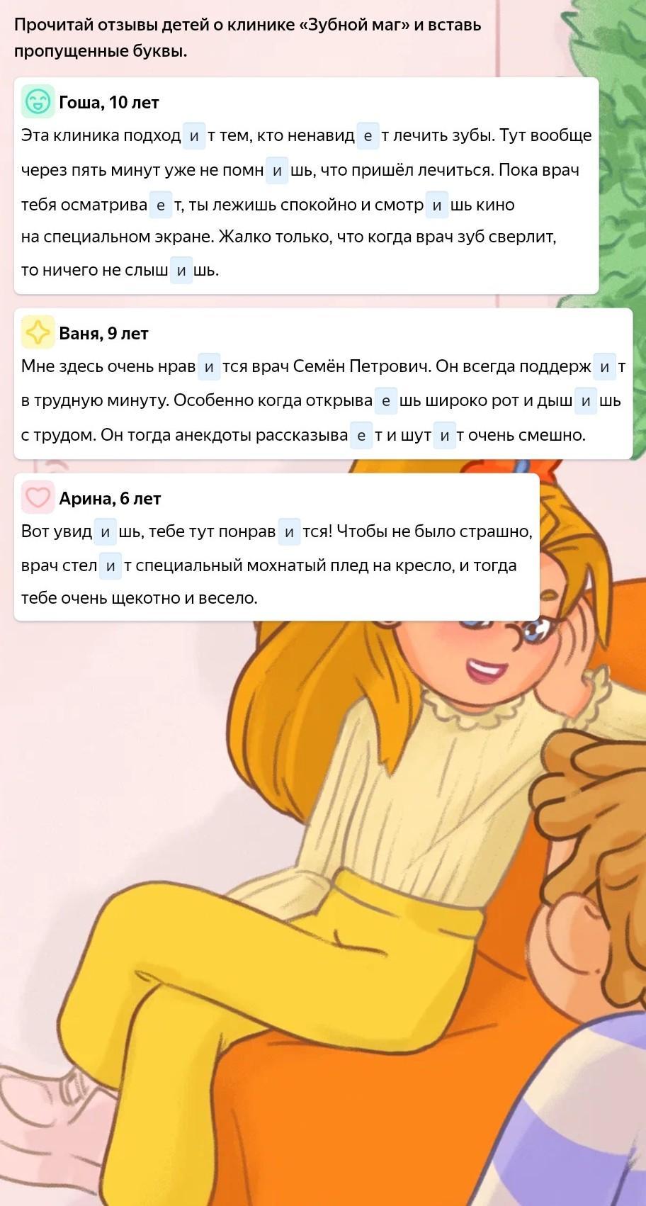 Прочитай отзывы детей о клинике «Зубной маг» и вставь пропущенные буквы. Гоша, 10 лет Эта клиника подход и т тем, кто ненавид е т лечить зубы. Тут вообще через пять минут уже не помн и шь, что пришёл лечиться. Пока врач тебя осматрива е т, ты лежишь спокойно и смотр и шь кино на специальном экране. Жалко только, что когда врач зуб сверлит, то ничего не слыш И ШЬ. Ваня, 9 лет Мне здесь очень нрав и тся врач Семён Петрович. Он всегда поддерж и т в трудную минуту. Особенно когда открыва е шь широко рот и дыши шь с трудом. Он тогда анекдоты рассказыва е тишут и точень смешно. Арина, 6 лет Вот увид и шь, тебе тут понрав и тся! Чтобы не было страшно, врач стел и т специальный мохнатый плед на кресло, и тогда тебе очень щекотно и весело.