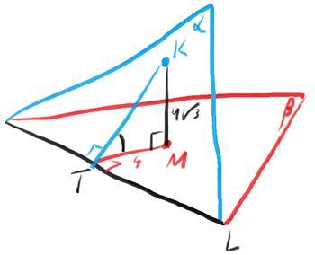 Площини a і b перетинаються по прямій I У площині a вибрано точку к i з неї проведено перпендикуляр КМ до площини b. Відстань від точки К до площини b дорівнює 4√3см, а відстань від точки М до прямої I 4см. Знайдіть кут між площинами a i b.