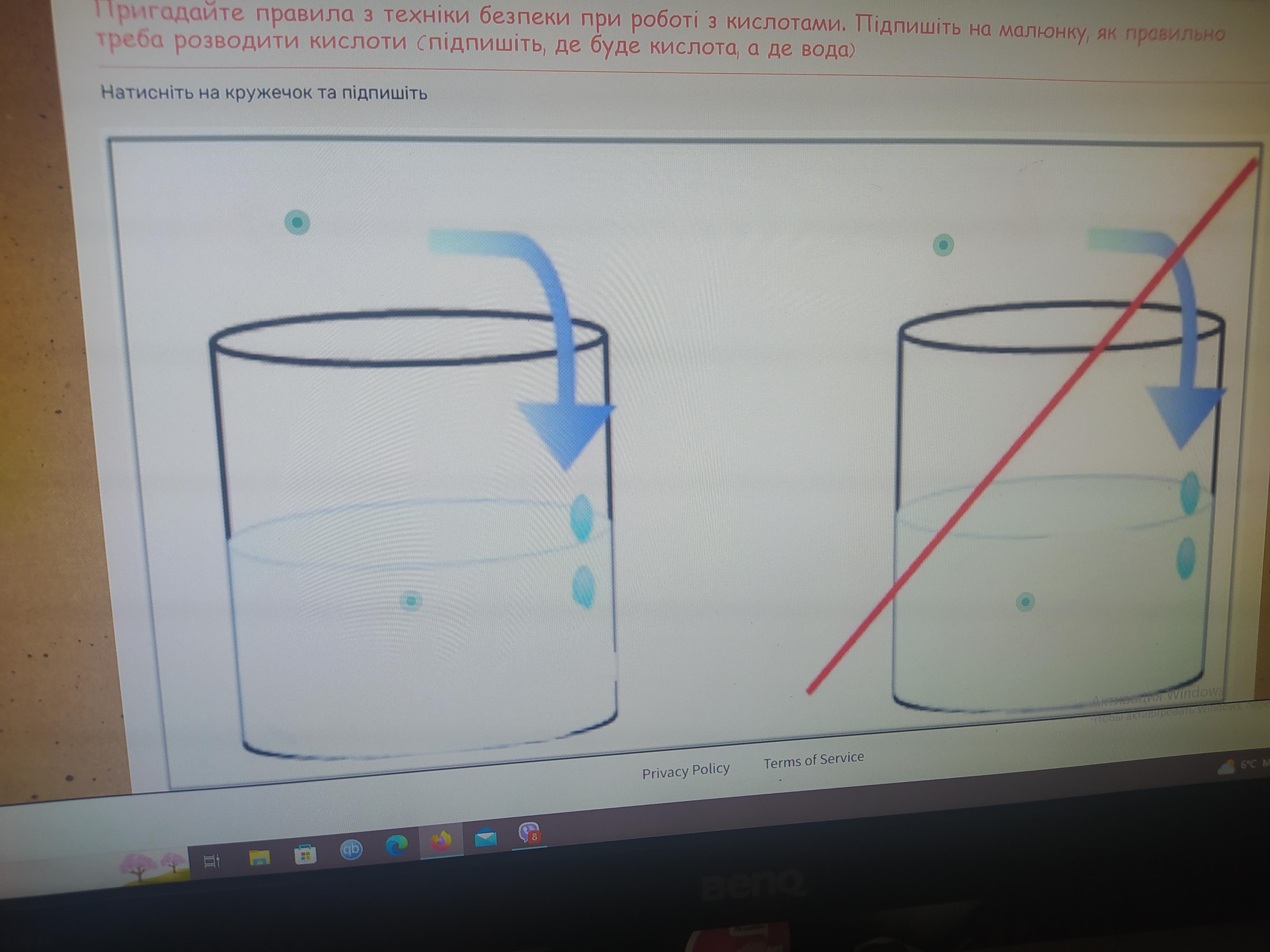 кислоту лиють у воду (зверху к-та, знизу вода)