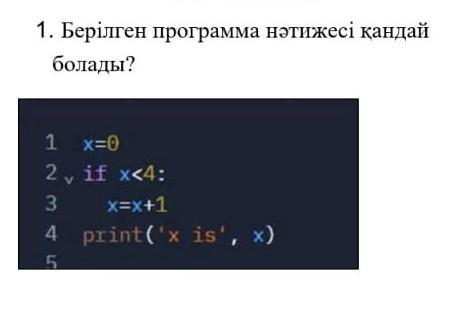 Берілген программада, егер x 4-тен кіші болса, x-ты 1-ге қосу жасалады. Орындалған коддан кейін, "x is" және x-ты чаптау үшін print() функциясы қолданылады. Алдағы код орындалғаннан кейін, x-ты 1-ге тең болады, сондықтан шығарылған мәтін "x is 1" болады.
