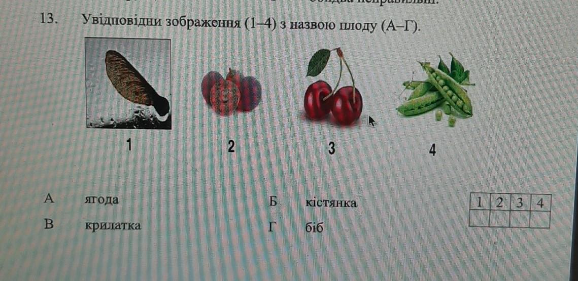 Срочно!!!! 13. Увідповідни зображення (1-4) з назвою плоду (А-Г). A В 1 ягода 10 крилатка 195 2 3 Кстянка 616 4 1 2 3 4