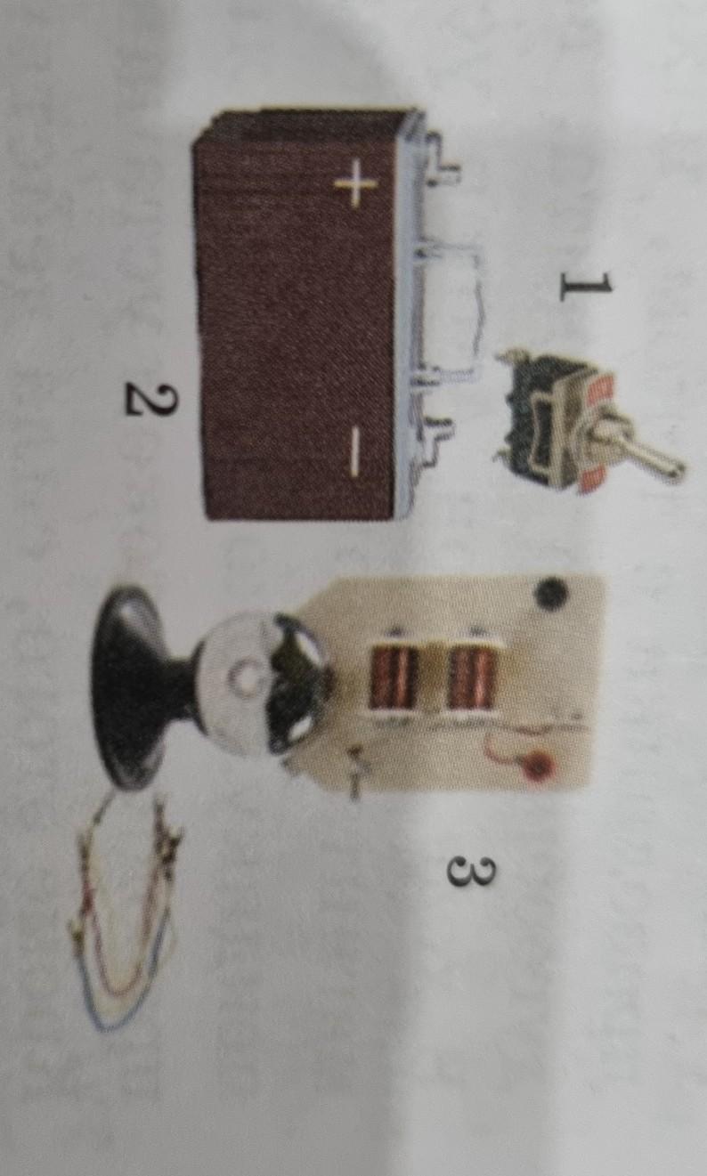 соедините проводами детали так чтобы можно было нажатием выключатель 1 привести звонок 3 в действие от аккумулятора 2