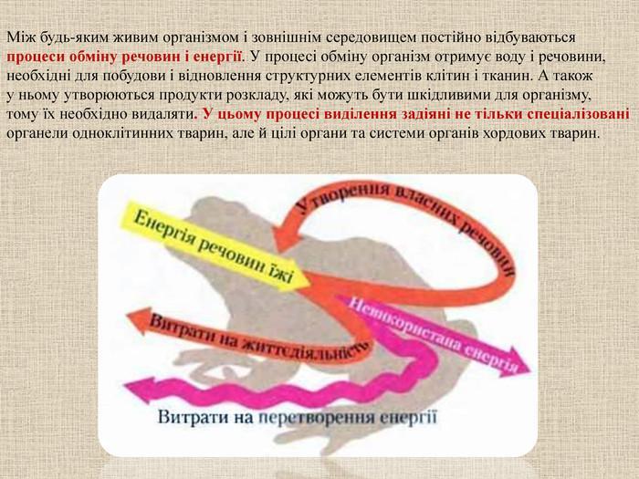 У процесі обміну речовин постійно утворюються кінцеві продукти обміну жирів, білків і вуглеводів, які вже не потрібні організму і навіть шкідливі для нього, а тому повинні бути видалені з організму. Процес виділення як складова частина обміну речовин – один із головних у збереженні гомеостазу.