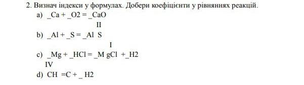 2. Визнач індекси у формулах. Добери коефіцієнти у рiвняннях реакцій. a) _Ca+ _O2= _Cao II b) _Al+_S=_Al S I c) _Mg + _HCl=_M gCl +_H2 IV d) CH =C +_ H2