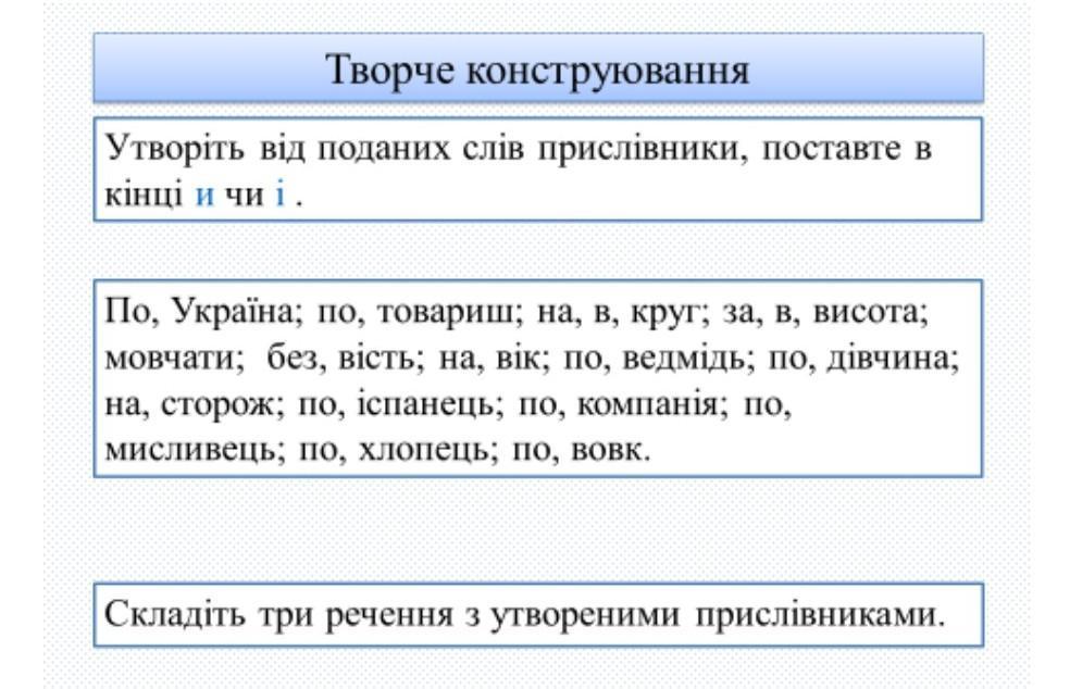 Творче конструювання Утворіть вiд поданих слів прислівники, поставте в кінці и чи і . ПО, Україна; по, товариш; на, в, круг; за, в, висота; мовчати; без, вiсть; на, вiк; по, ведмідь; по, дiвчина; на, сторож; по, іспанець; по, компанія, по, Мисливець; по, хлопець; по, вовк. Складіть три речення з утвореними прислівниками.