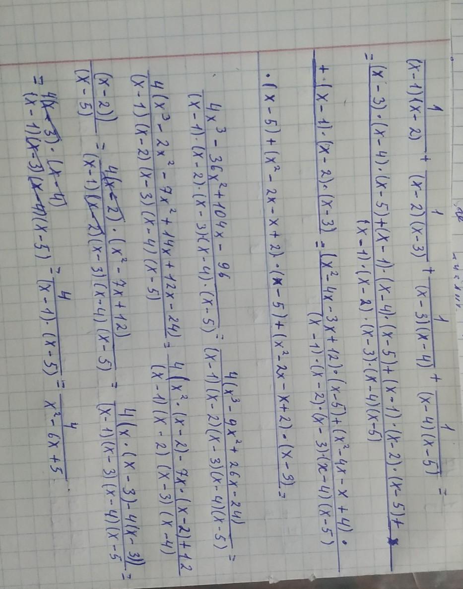 упростить выражение 1/(x-1)(x-2)+1/(x-2)(x-3)+1/(x-3)(x-4)+1/(x-4)(x-5) должно получиться 4/(x^2-6x+5)