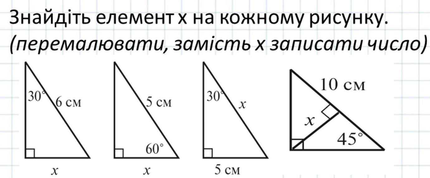 Объяснение: в первых трех случаях действует правило - напротив угла в 30 градусов лежит сторона, равная половине гипотенузы=>