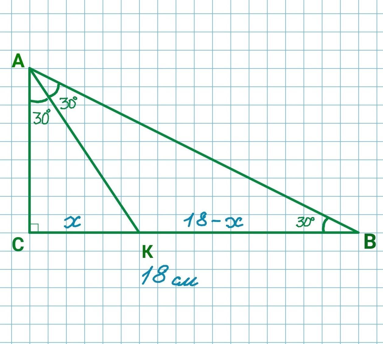 4) Позначимо СК=х (см), тоді КВ=АК=(18-х) (см)
