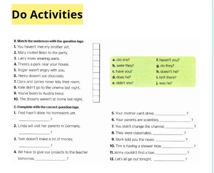 C. 1) ..has he? 2) ..won't she? 3) ..does he? 4).. haven't we? 5)..can she? 6).. aren't they? 7).. did you? 8).. weren't they? 9).. hasn't he? 10) .. isn't he? 11) .. could she? 12) ..shall we?