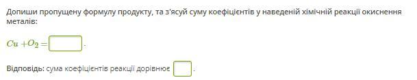 Допиши пропущену формулу продукту, та з'ясуй суму коефіцієнтів у наведеній хімічній реакції окиснення металів: