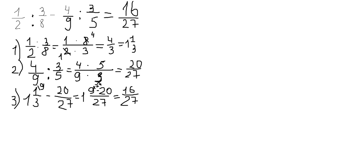 1/2 : 3/8 = 1/2 * 8/3 = 1 1/3 (Одна целая одна третья)