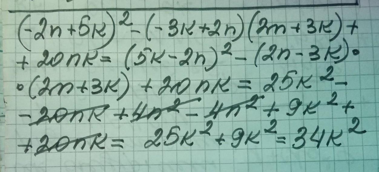 ДОПОМОЖіТЬ Спростіть вираз (-2n+5k)2-(-3k+2n)(2n+3k)+20nk