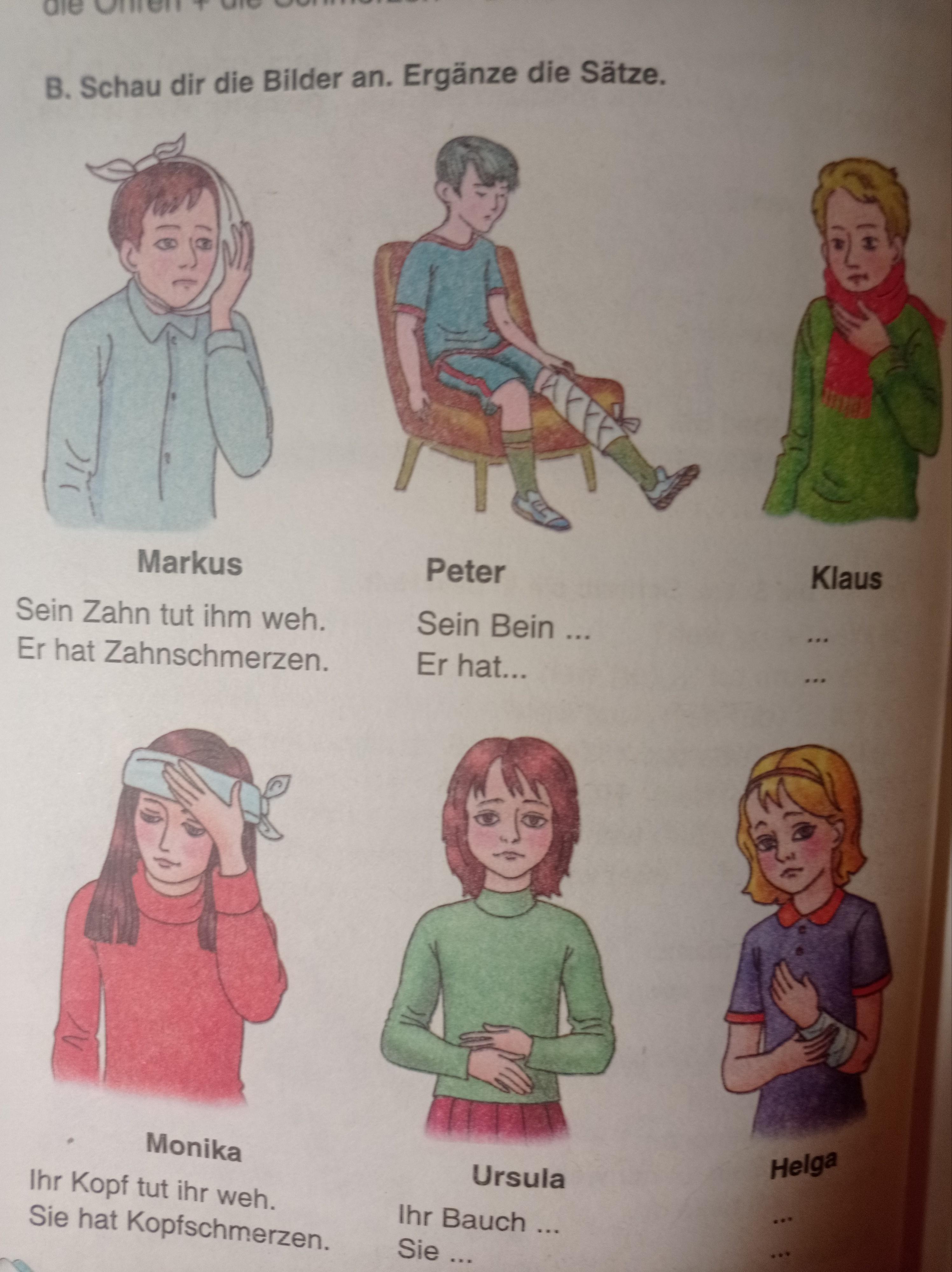 Ответ:Peter: Sein Bein tut ihm weh. Er hat Beinschmerzen. Klaus: Sein Hals tut ihm weh. Er hat Halsschmerzen. Ursula: Ihr Bauch tut ihr weh. Sie hat Bauchschmerzen. Helga: Ihr Arm tut ihr weh. Sie hat Armschmerzen