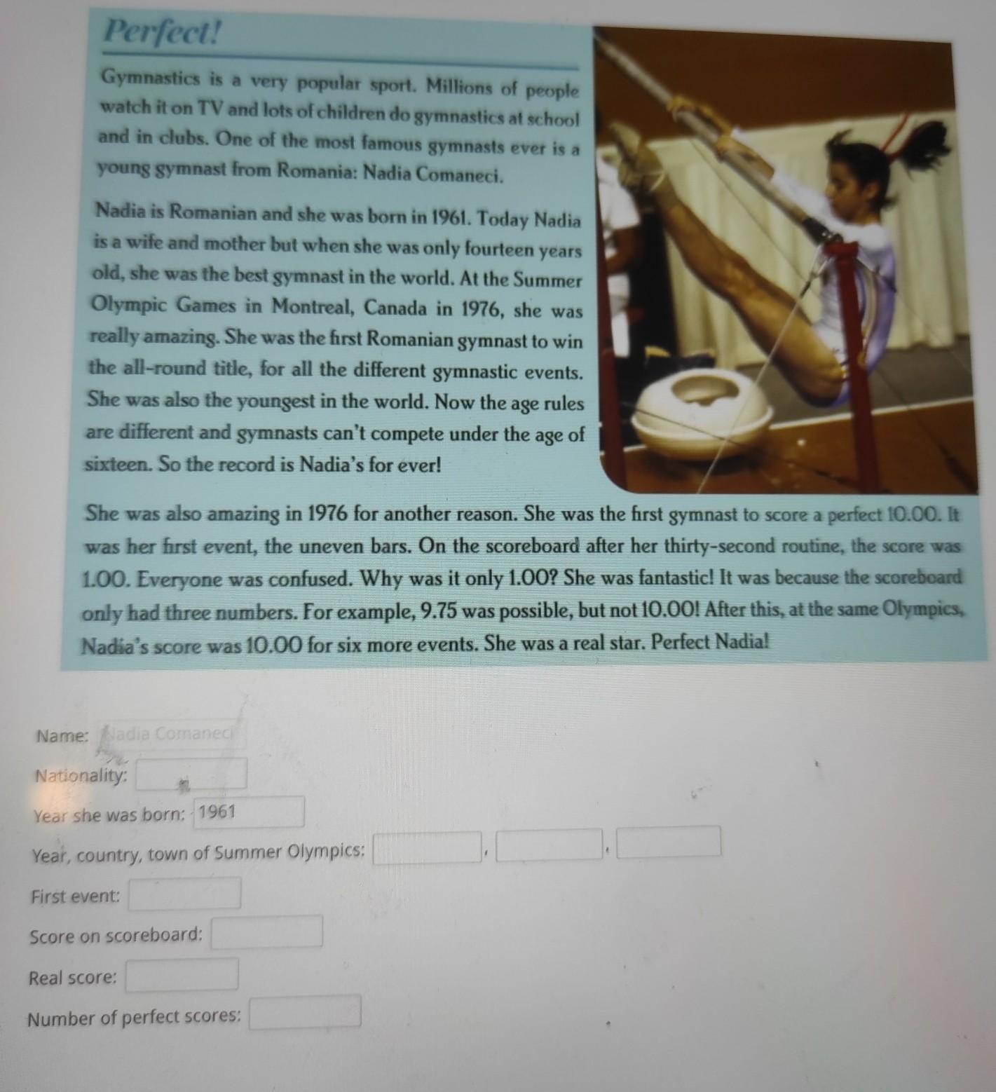 Exercise 3 Read the text and complete the information below. Perfect! Gymnastics is a very popular sport. Millions of people watch it on TV and lots of children do gymnastics at school and in clubs. One of the most famous gymnasts ever is a young gymnast from Romania: Nadia Comaneci. Nadia is Romanian and she was born in 1961. Today Nadia is a wife and mother but when she was only fourteen years old, she was the best gymnast in the world. At the Summer Olympic Games in Montreal, Canada in 1976, she was really amazing. She was the first Romanian gymnast to win the all-round title, for all the different gymnastic events. She was also the youngest in the world. Now the age rules are different and gymnasts can't compete under the age of sixteen. So the record is Nadia's for ever! She was also amazing in 1976 for another reason. She was the first gymnast to score a perfect 10.00. It was her first event, the uneven bars. On the scoreboard after her thirty-second routine, the score was 1.00. Everyone was confused. Why was it only 1.00? She was fantastic! It was because the scoreboard only had three numbers. For example, 9.75 was possible, but not 10.00! After this, at the same Olympics, Nadia's score was 10.00 for six more events. She was a real star. Perfect Nadia!
