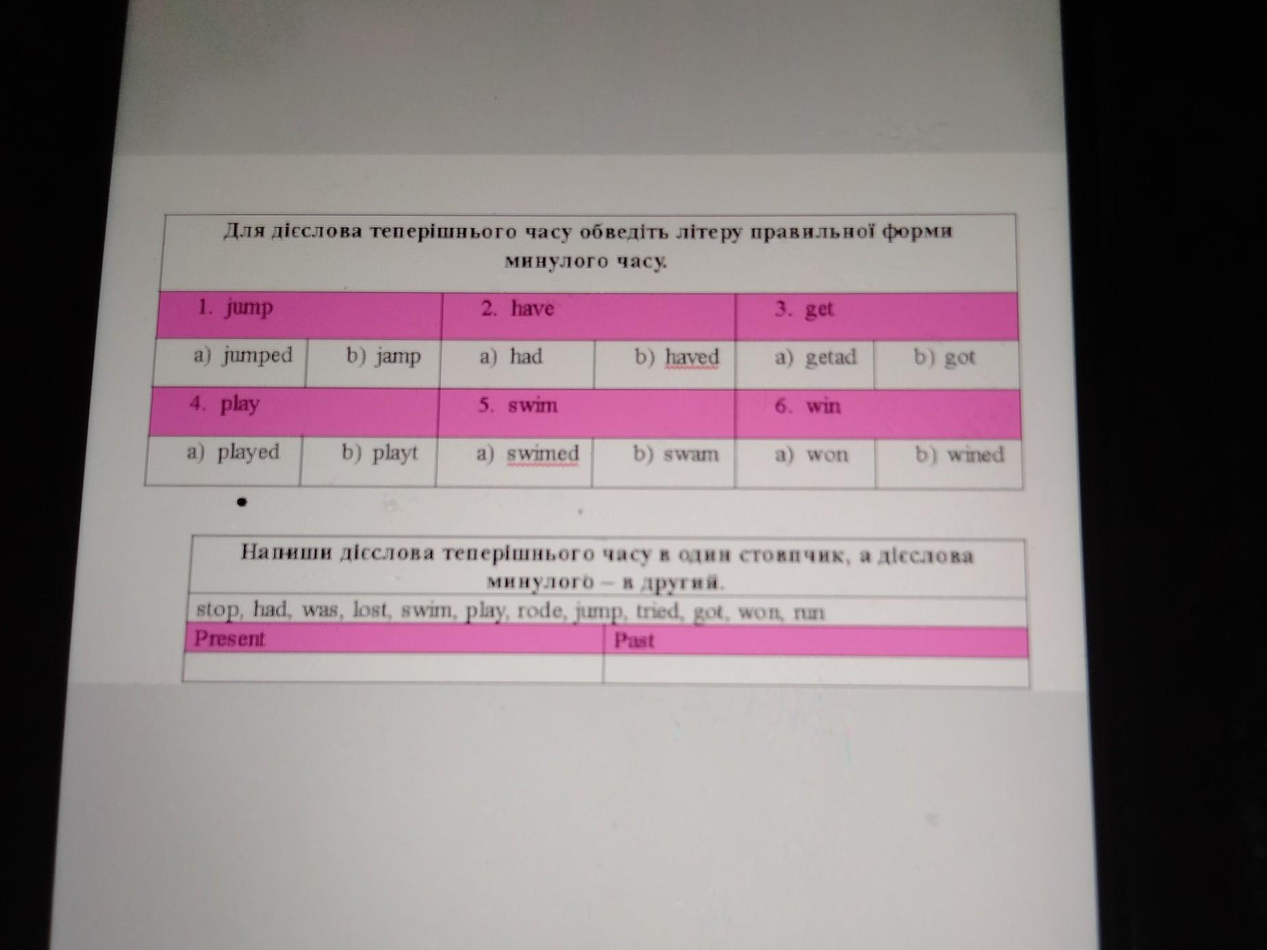 Для дієслова теперішнього часу обведіть літеру правильної форми минулого часу. 1. jump a) jumped 4. play a) played b) jamp b) playt 2. have a) had 5. swim a) swimed b) haved b) swam 3. get a) getad 6. win a) won b) got b) wined