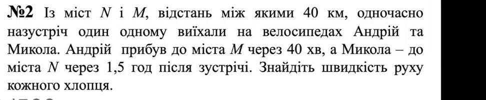 Ми знаємо, що відстань між містами N і M дорівнює 40 км, тому ми можемо скласти наступне рівняння: