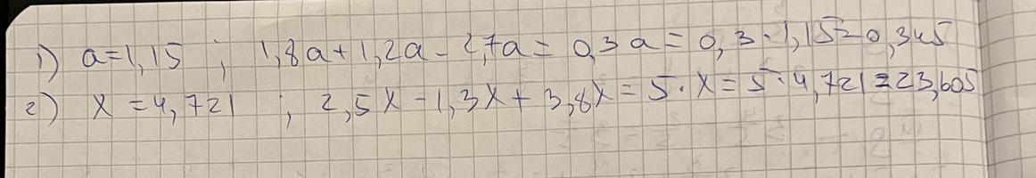 Спрости вираз й обчисли його значення: 1) 1,8a + 1,2a - 2,7a якщо a = 1,15 2) 2,5x - 1,3x + 3,8x якщо x =4, 721