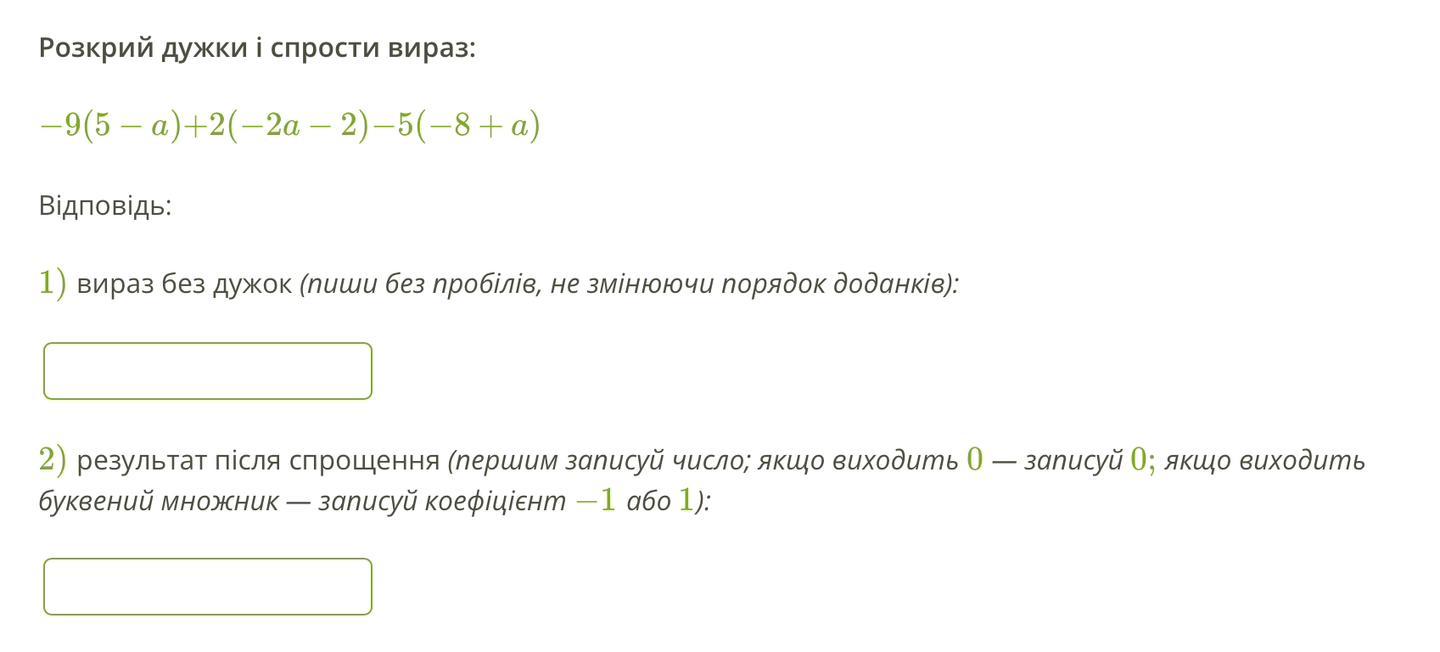 2) результат після спрощення (першим записуй число; якщо виходить 0) — записуй 0; якщо вихоё
