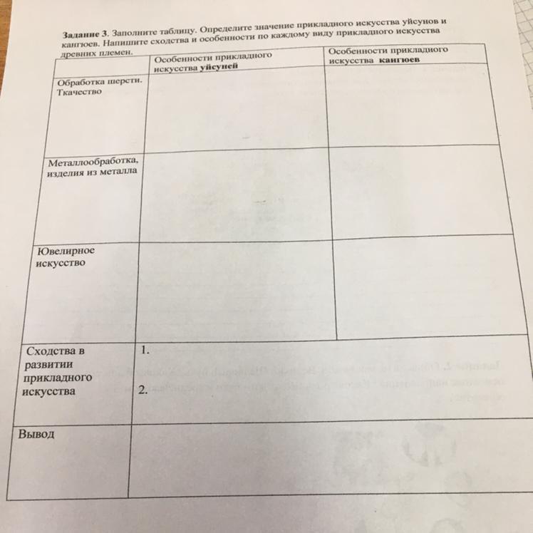 Задание 3. Заполните таблицу. Определите значение прикладного искусства уйсунов и