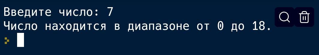 Этот код позволяет проверить, находится ли введенное пользователем число в диапазоне от 0 до 18. Сначала пользователю предлагается ввести число с помощью функции input(), после чего оно преобразуется в целое число с помощью функции int(). Затем с помощью операторов сравнения и логического оператора and мы проверяем, что число больше или равно 0 и меньше или равно 18. Если число находится в этом диапазоне, то программа выводит сообщение "Число находится в диапазоне от 0 до 18." на экран, а если число не удовлетворяет условию, то программа выводит сообщение "Число находится за пределами диапазона от 0 до 18.".