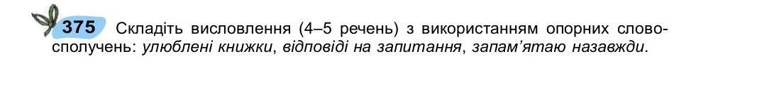 375 Складіть висловлення (4-5 речень) з використанням опорних слово- сполучень: улюбленi книжки, відповіді на запитання, запам'ятаю назавжди.