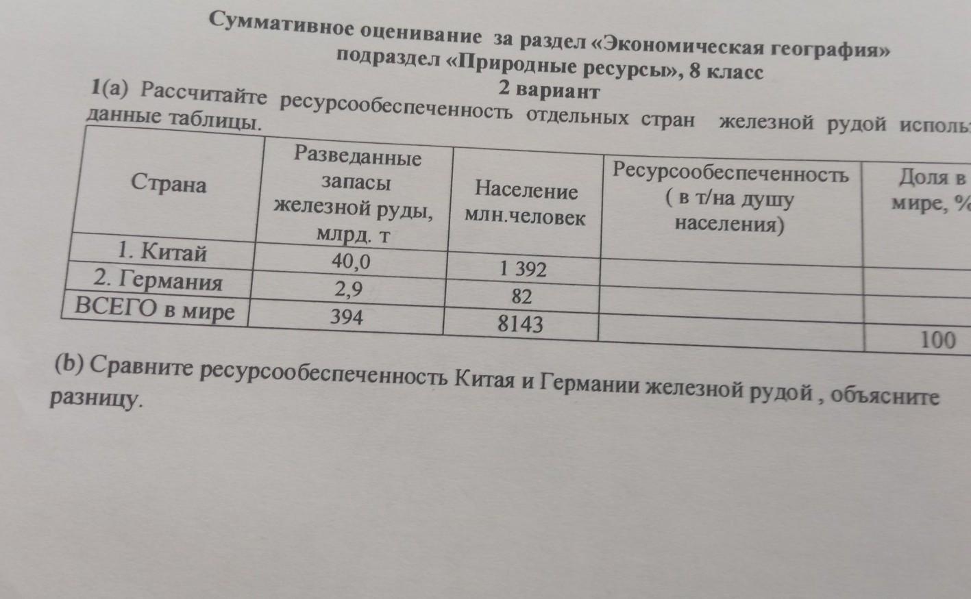 1(a) рассчитайте ресурсообеспеченность отдельных стран железной рудой используя данные таблицы. Страна 1. Китай 2. Германия ВСЕГО В мире Разведанные запасы железной руды, млрд. т 40,0 2,9 394 Население млн.человек 1 392 82 8143 Ресурсообеспеченность ( в т/на душу населения) Доля в мире, % 100 (b) Сравните ресурсообеспеченность Китая и Германии железной рудой, объясните разницу.