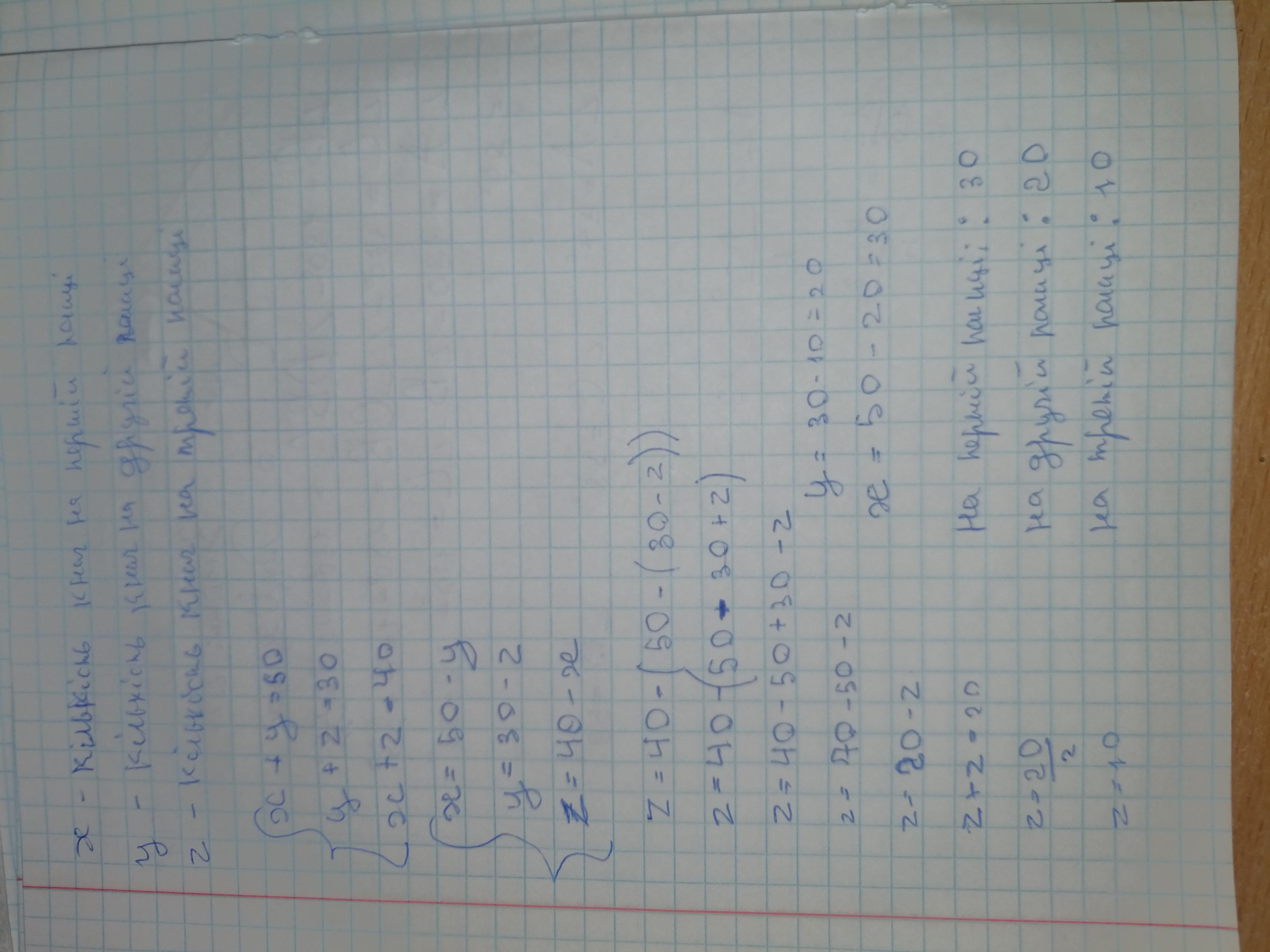 На першій і другій полицях стоїть 50 книг, на другій і третій - 30, на першій і третій - 40. Скільки книг на кожній полиці?