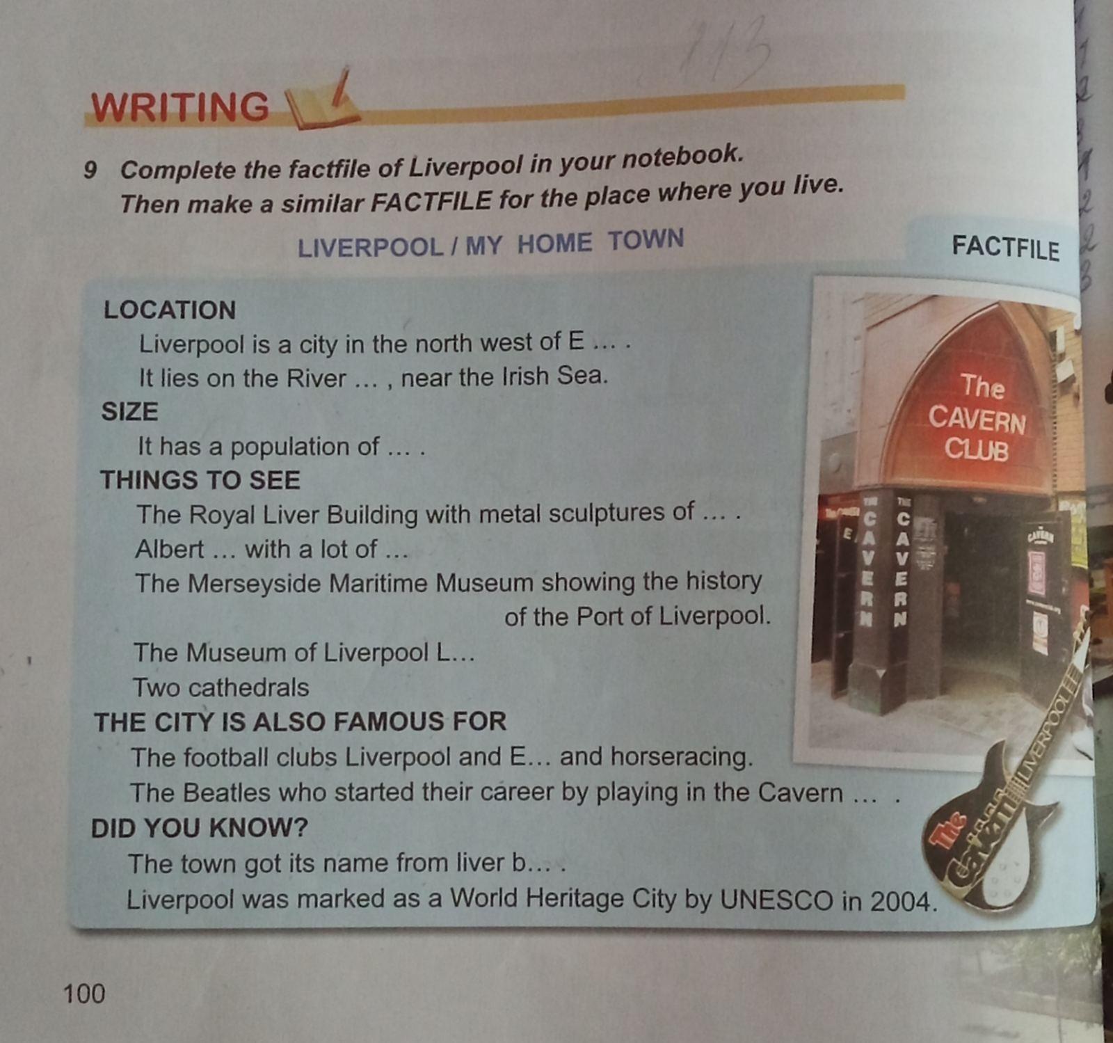 9 Complete the factfile of Liverpool in your notebook. Then make a similar FACTFILE for the place where LIVERPOOL / MY HOME TOWN LOCATION Liverpool is a city in the north west of E.... It lies on the River ..., near the Irish Sea. SIZE It has a population of .... THINGS TO SEE you live. The Royal Liver Building with metal sculptures of .... Albert ... with a lot of ... The Merseyside Maritime Museum showing the history of the Port of Liverpool. The Museum of Liverpool L... Two cathedrals CCAVERN FACTFILE The CAVERN CLUB THE CITY IS ALSO FAMOUS FOR The football clubs Liverpool and E... and horseracing. The Beatles who started their career by playing in the Cavern ... DID YOU KNOW? The town got its name from liver b... . Liverpool was marked as a World Heritage City by UNESCO in 2004. CAVERN Can LIVERP The