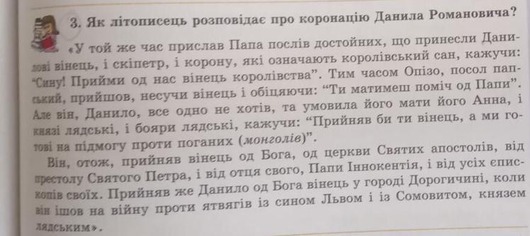 Прийми од нас вінець королівства”. Тим часом Опізо, посол папський, прийшов, несучи вінець і обіцяючи: “Ти матимеш поміч од папи”. Але він, Данило, все одно не хотів, та умовила його мати його Анна, і князі лядські, і бояри лядські, кажучи: “Прийняв би ти вінець, а ми готові на підмогу проти поганих (монголів)”.
